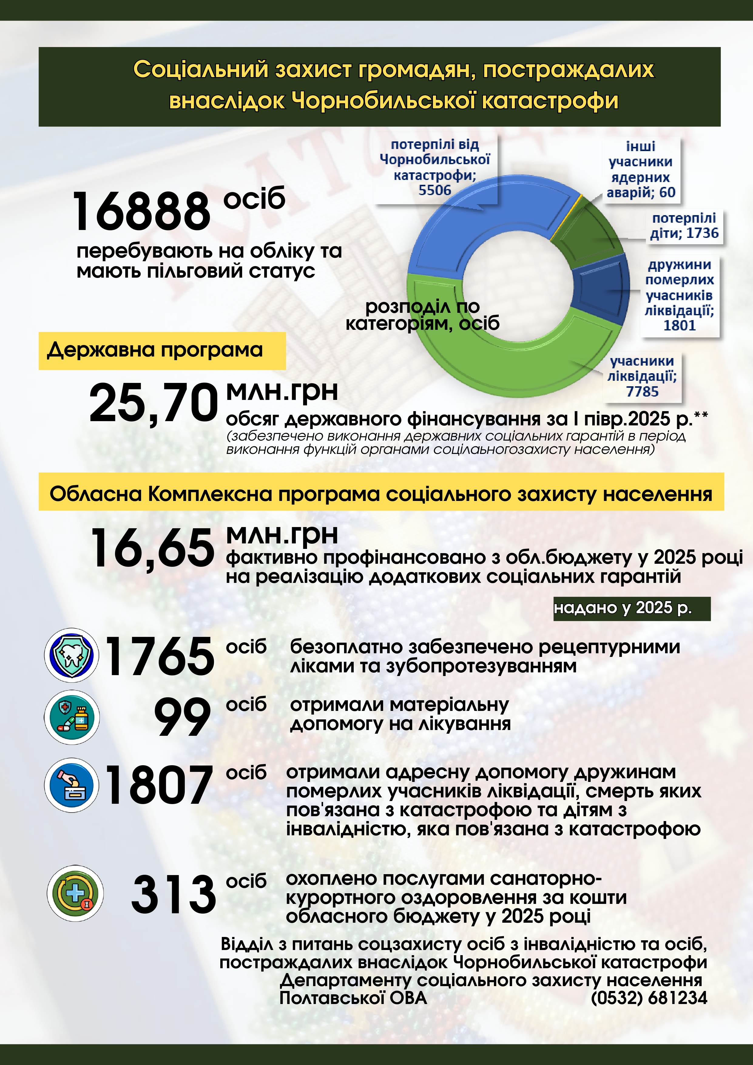 Відповідно до заходів Комплексної програми соціального захисту населення Полтавської області на напрямки додаткової соціальної підтримки громадянам, постраждалим внаслідок Чорнобильської катастрофи, у поточному році з обласного бюджету спрямовано 16,65 млн.грн, з них: