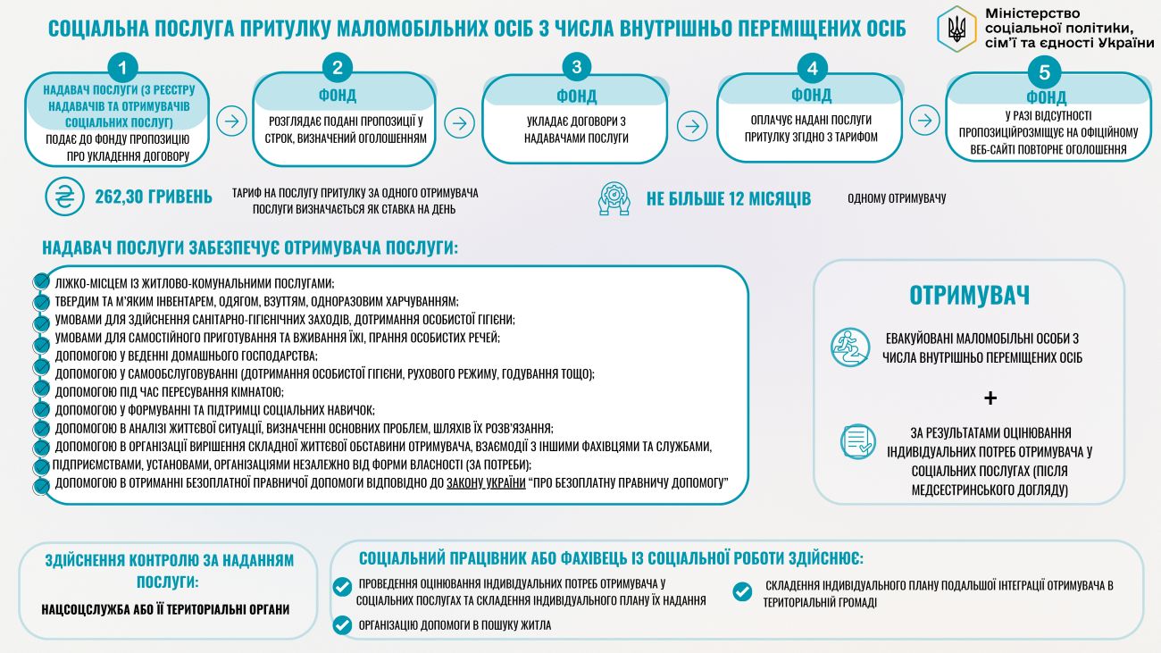 Детальну інформацію щодо участі в експериментальному проекті із запровадження договірної форми надання соціальної послуги притулку маломобільним особам з числа внутрішньо переміщених осіб розміщено – на веб-порталі Фонду в рубриці ,,Реалізація пілотних проектів щодо закупівлі соцпослуг”, в підрубриці ,,Соціальна послуга ПРИТУЛКУ МАЛОМОБІЛЬНИМ ОСОБАМ З ЧИСЛА ВНУТРІШНЬО ПЕРЕМІЩЕНИХ ОСІБ” https://surl.li/tvoalq