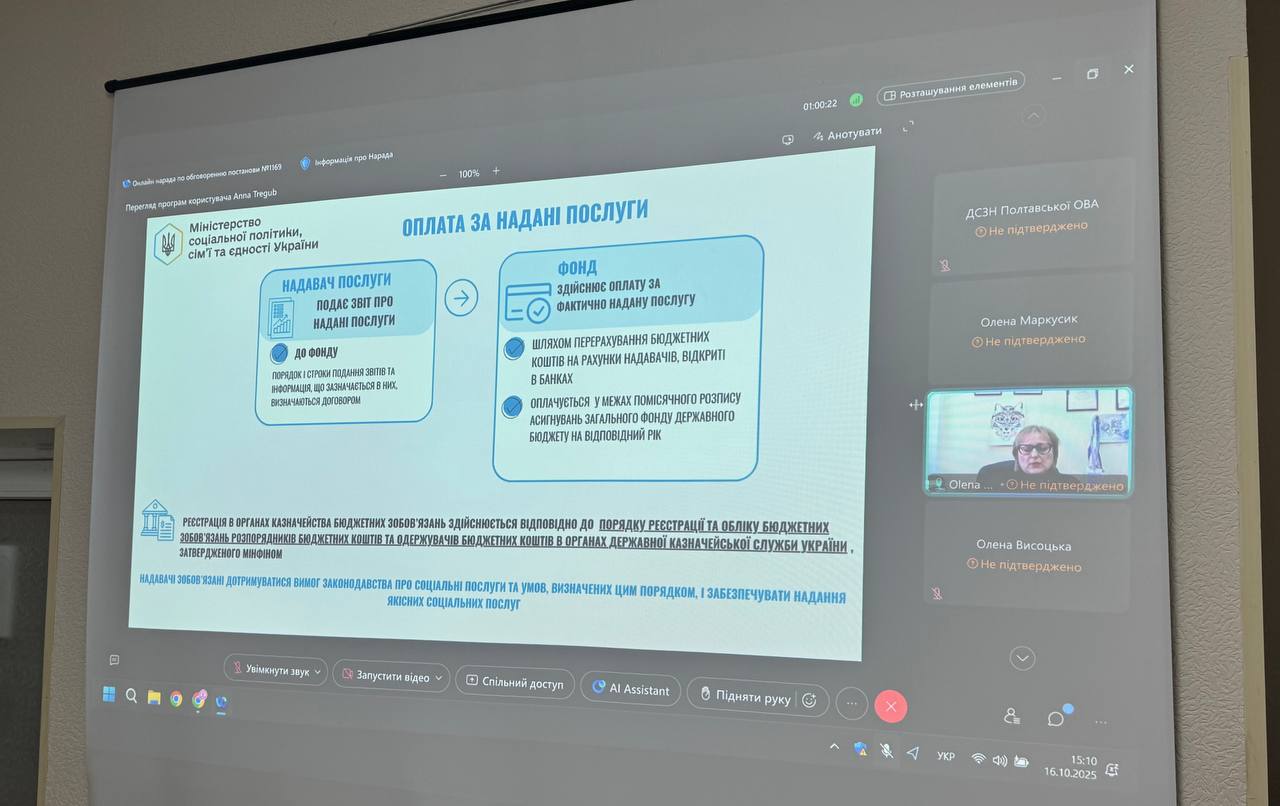 Відтак представники Департаменту соціального захисту населення ОВА, на чолі з Директоркою Людмилою Корнієнко долучились до робочої наради з Мінсоцполітики щодо виконання постанови КМУ від 17 вересня 2025 № 1169 ,,Деякі питання підтримки внутрішньо переміщених осіб”.
