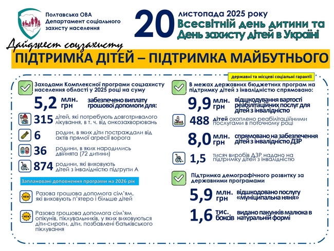 З нагоди Всесвітнього дня дитини та Дня захисту дітей в Україні Департаментом підготовлено Дайджест соцзахисту: «Підтримка дітей – підтримка майбутнього», адже Полтавщина має низку успішних, а головне корисних кейсів щодо позитивного впливу на життя дітей з інвалідністю, дітей чиї родини опинились в складних життєвих обставинах та потребують особливої уваги з боку громади та області.