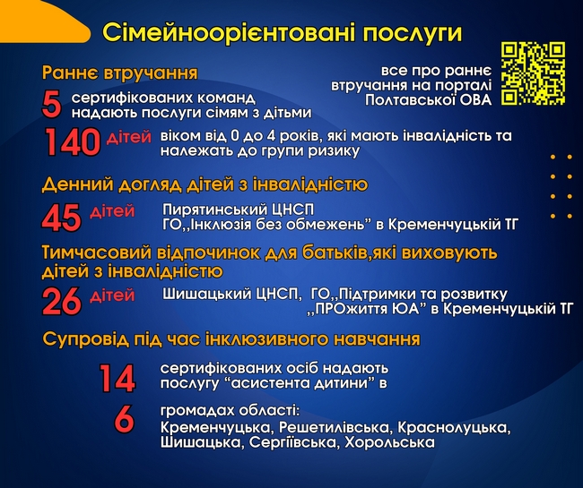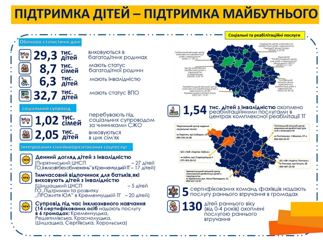 Відтак Полтавський міський центр комплексної реабілітації для осіб з інвалідністю, які і їх кременчуцькі колеги, впроваджує послугу раннього втручання - міждисциплінарної допомоги сім’ям з дітьми раннього віку(від народження до 4-х років), у яких є порушення розвитку або високий ризик набуття інвалідності. Більше про послугу можна дізнатись на сторінці портал https://poda.gov.ua/attachments/207171.
