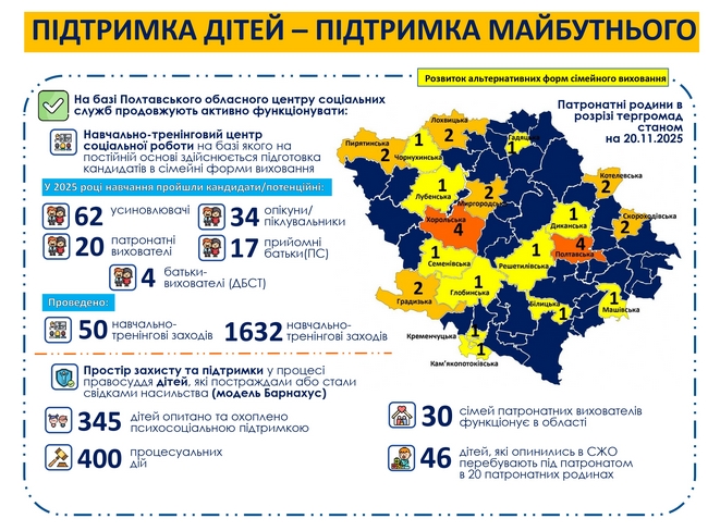 Лише за цей рік на базі Полтавського обласного центру соціальних служб обов’язкове навчання пройшли 137 кандидатів в усиновителі, опікуни/піклувальники, батьки вихователі, прийомні батьки які готові бути батьками «по серцю» для дітей, які опинились в складних життєвих обставинах та поза батьківського піклування.
