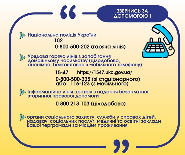 Кожна особа повинна чітко розуміти, що вона ніколи не залишиться наодинці зі своєю проблемою та має широкий спектр інструментів та установ, як державного так і громадського сектору, куди може звернутись за допомогою.