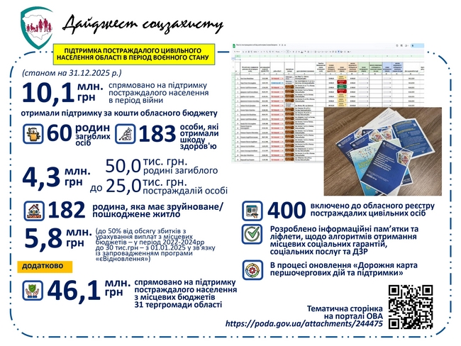 «Відтак в поточному році завершено виконання Комплексної програми соціального захисту населення, яка діяла в 2021 - 2025 роках – чи не найвайжчий період в житті області, коли наклались наслідки Ковід-пандемії, а також початок та сьогодення повномасштабного вторгнення ворога до України. Завдяки спільні роботі з громадами, партнерами та громадськими організаціями дозволили забезпечити щорічну підтримку в середньому для 20-30 тисяч мешканців області з числа 16 пільгових категорій та осіб, які опинились в складних життєвих обставинах.