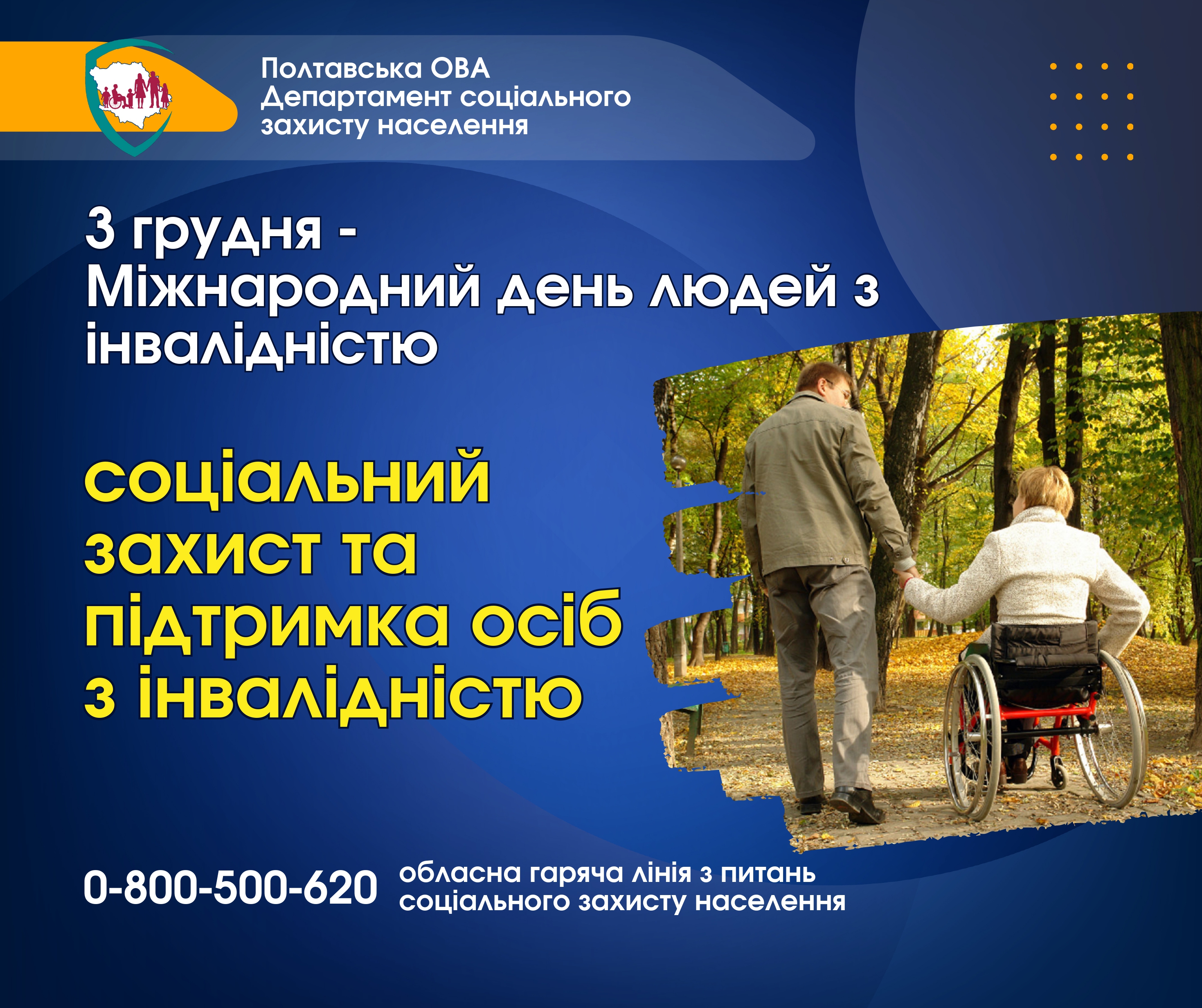 З усіх питань щодо забезпечення прав осіб з інвалідністю на соціальний захист Ви можете звернутись до Департаменту через безкоштовну обласну гарячу лінію за телефоном 0-800-500-620.