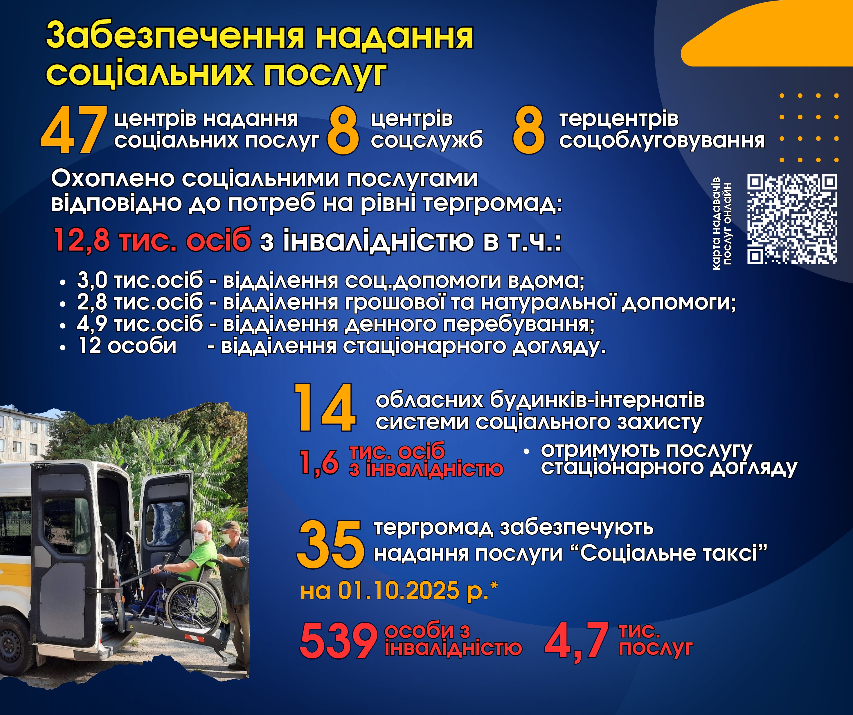 На сьогодні у громадах області 19 територіальних центрів соціального обслуговування та 36 центрів надання соціальних послуг забезпечують обслуговування понад 70 тисяч осіб, в тому числі 4,5 тисяч осіб, які мають статус ВПО. Важливо, що попри війну, 6 таких центрів розпочали діяльність в поточному році.