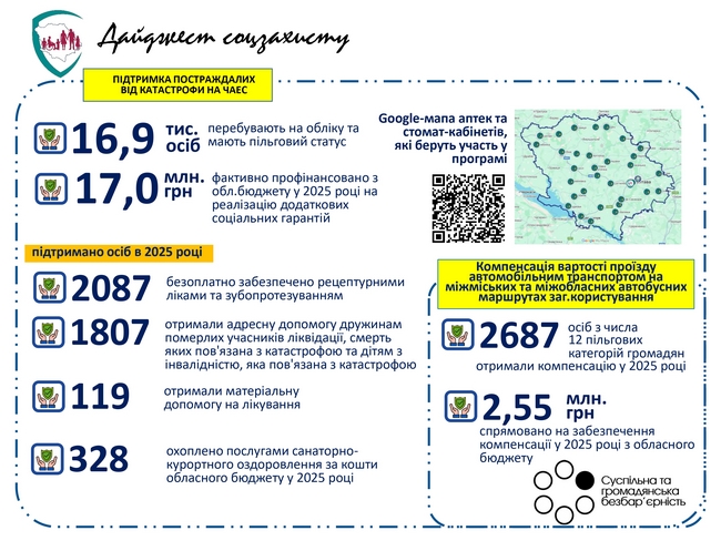 Серед успішних кейсів: адресна підтримка членів родин померлих учасників ліквідації наслідків аварії на Чорнобильській АЕС та сім’ям, які виховують дітей з інвалідністю, яка пов’язана з наслідками Чорнобильської катастрофи; матеріальна допомога на лікування та оздоровлення в санаторно-курортних закладах; забезпечення санаторно-курортним лікуванням, а також забезпечення медикаментами за рецептами лікарів та зубопротезуванням. Такі заходи будуть продовжені і в поточному році.