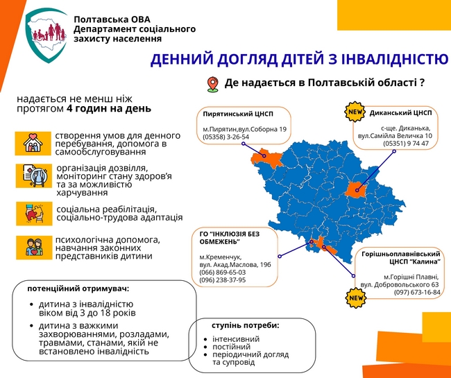 Для цього при комунальних надавачах соціальних послуг: ЦНСП «Калина» Горішньоплавнівської міської ради та ЦНСП Диканської селищної ради створені відповідні відділення денного перебування та введені додаткові штатні одиниці. Послуги для отримувачів надаються безкоштовно за кошти місцевого бюджету.