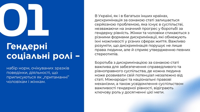 Національна соціальна сервісна служба України спільно з Міністерство культури України та Держкомтелерадіо створили інформаційну пам’ятку, яка доступно розповідає про основні упередження щодо статі, формування гендерних ролей та важливість впровадження системних змін у сфері публічного управління, оборонного сектору та соціальної політики.