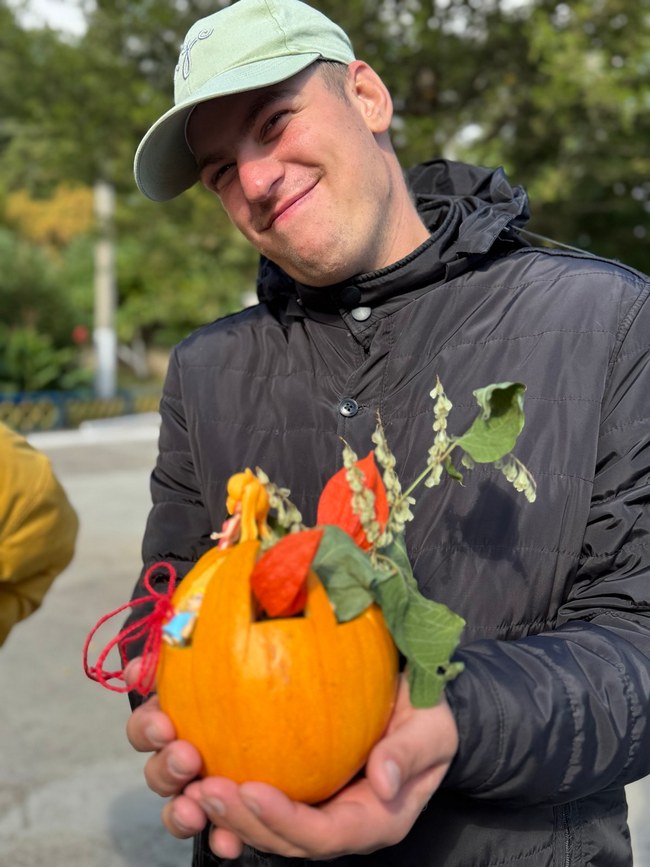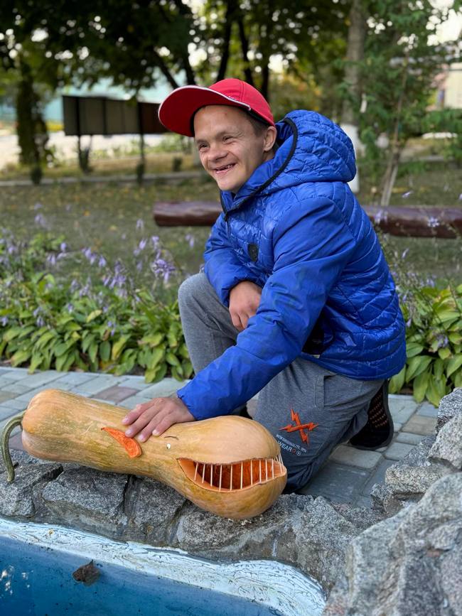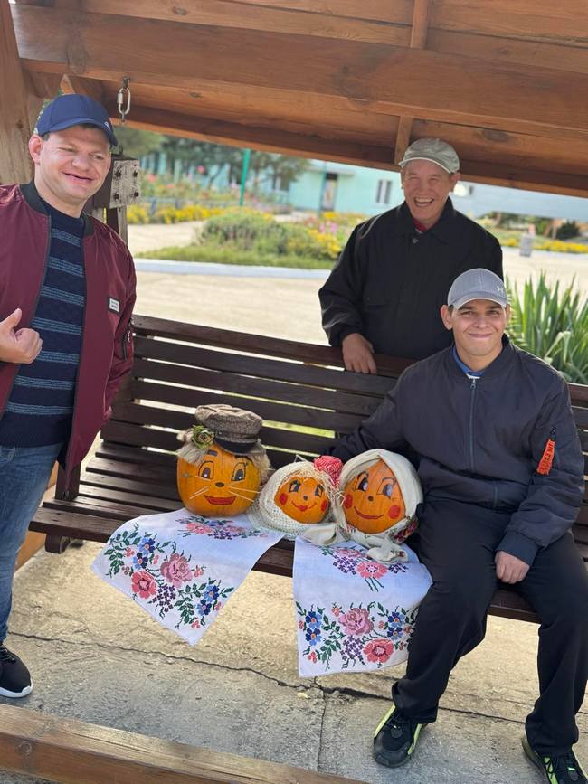Підопічні Кротівського психоневрологічного будинку-інтернату із великим задоволенням долучилися до колективної роботи зі створення яскравої осінньої фотозони, основним персонажем якої став гарбуз.
