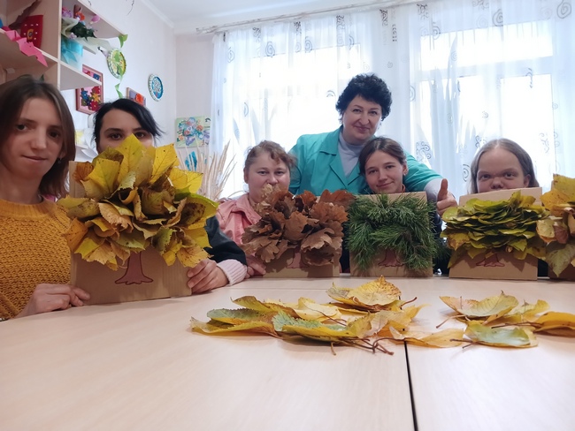 Дівчата з великим захопленням створювали осінні композиції, використовуючи різнокольорове листя, гілочки хвойних дерев та інші природні матеріали. Для основи вони виготовляли шаблони з картону, на які заздалегідь наклеювали стовбур дерева з кольорового паперу. Потім у спеціально зроблені отвори вставляли зібране листя чи гілки – так поступово народжувалися яскраві листяні та хвойні дерева.
